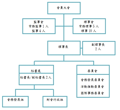 (一)本會以會員大會為最高權力機構,下設理事會,置理事十人,常務理事五人;另設監事會,置監事四人,常務監事一人,現任理事長為歐晋德先生,副理事長二人,由翁文祺先生與龔仁文先生擔任,監事會主席由何美玥女士擔任。