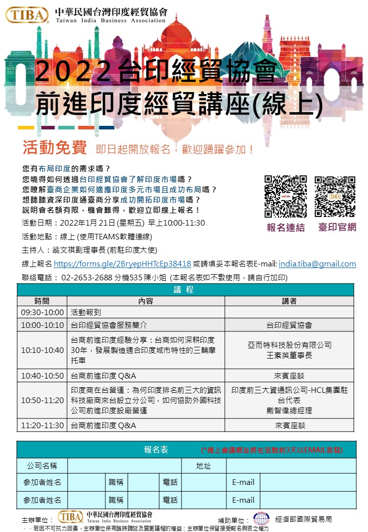 | 活動說明 | 2022年台印經貿協會前進印度經貿講座 (線上)您有布局印度的需求嗎? 您曉得如何透過台印經貿協會了解印度市場嗎? 您瞭解臺商企業如何適應印度多元市場且成功布局嗎? 想聽聽資深印度通臺商分享成功開拓印度市場嗎? 說明會名額有限,機會難得,歡迎立即線上報名! 活動日期:2022年1月 21日 (星期五) 早上10:00-11:30 活動地點:線上 (使用TEAMS軟體連線) 主持人: 翁文祺副理事長 (前駐印度大使) 線上報名 https://forms.gle/2BryepHHTcEp38418 或 請填妥本報名表後 E-mail: india.tiba@gmail.com 聯絡電話: 02-2653-2688 分機535 陳小姐 (本報名表如不敷使用,請自行加印) 議程 |