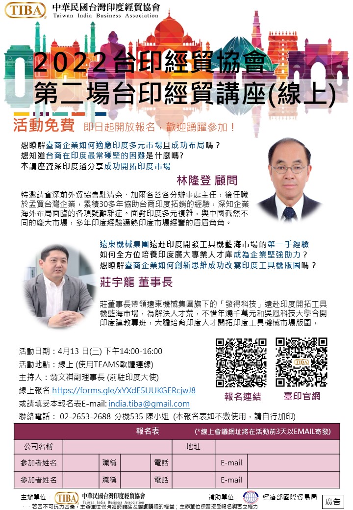| 活動說明 | 2022年第二場台印經貿講座 (線上)您對印度龐大內需市場充滿好奇嗎?印度廣大商機與人口紅利,讓您心動不己準備前進印度嗎?您瞭解臺商企業如何適應印度多元市場且成功布局嗎?想聽聽資深印度通臺商分享成功開拓印度市場嗎?說明會名額有限,機會難得,歡迎立即線上報名!活動日期:4月13 日(三) 下午14:00-16:00活動地點:線上 (使用TEAMS軟體連線)主持人:翁文祺副理事長 (前駐印度大使)主辦單位: 中華民國台灣印度經貿協會補助單位: 經濟部國際貿易局線上報名 https://forms.gle/xYXdE5UUKGERcjwJ8 或請填妥本報名表E-mail: india.tiba@gmail.com聯絡電話: 02-2653-2688 分機535 陳小姐 (本報名表如不敷使用,請自行加印)