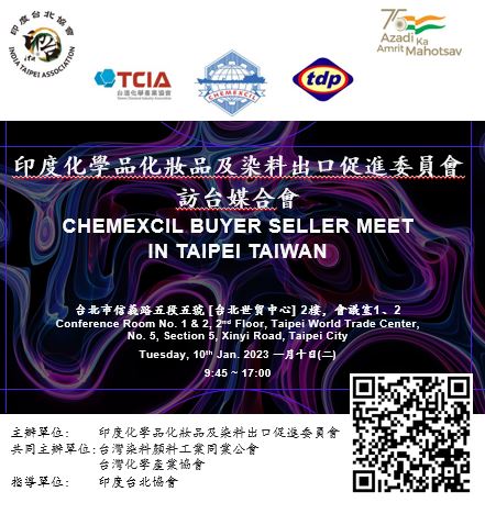 | 活動說明 | 印度商務部所屬的化學品化妝品及染料出口促進委員會 CHEMEXCIL 與 台灣染料顏料工業同業公會 及 台灣化學產業協會 TCIA 將於2023年1月10日合辦一場「印度貿易洽談會」。CHEMEXCIL即將帶領30家印度廠商來台拓展商機。本代表團會有印度的染料、化學品及化妝品產業參與,希望尋找台灣潛在供應商、買主以及新的合作夥伴。