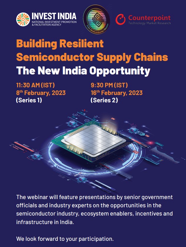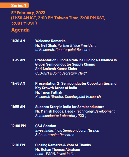 | 活動說明 | 投資印度辦公室 (Invest India) 謹訂於2023年 2月 8日 (星期三) 14:00-15:00辦理印度半導體供應鏈機遇說明會(線上),本活動與知名國際調研公司Counterpoint合作舉辦,探討印度半導體商機與生態系結構,歡迎踴躍報名參加!! 議程(台灣時間14:00開始):