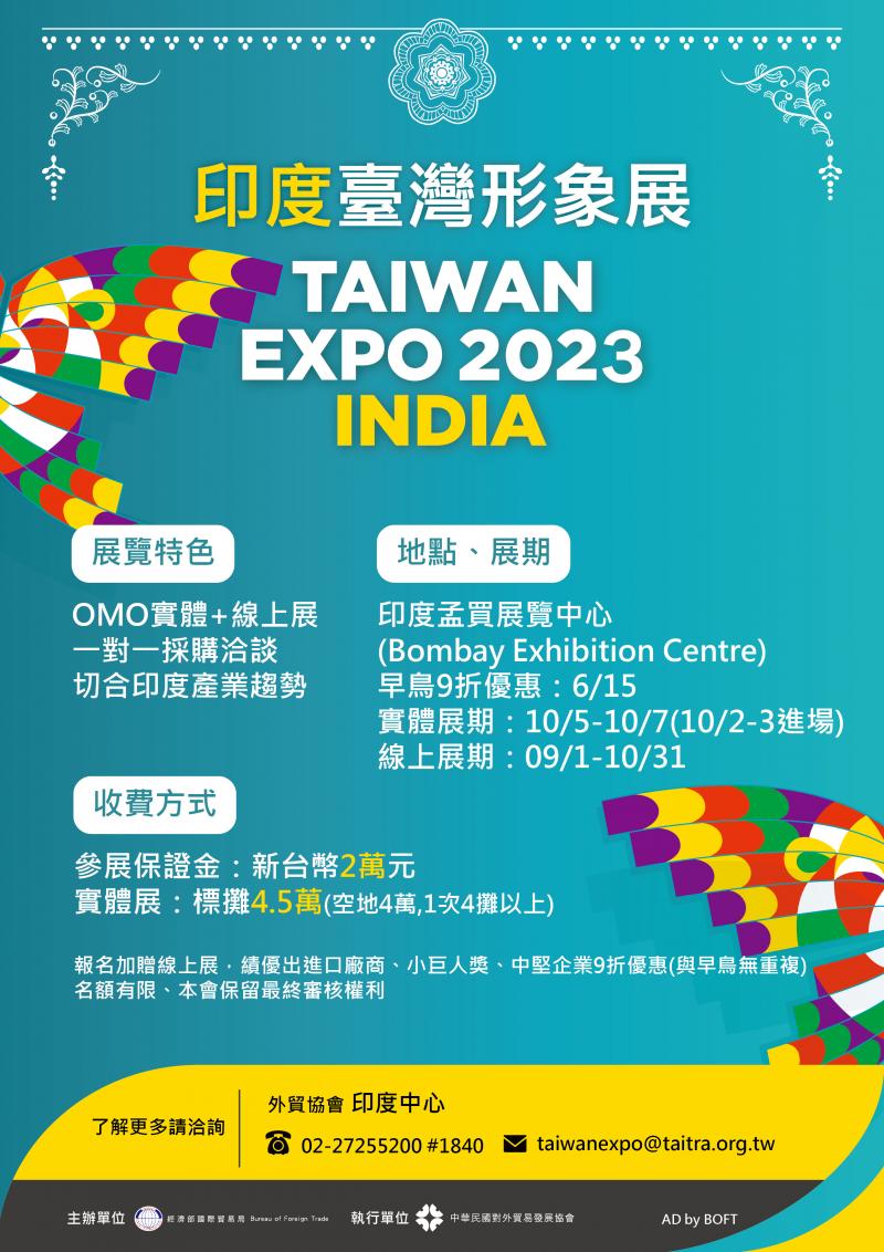 | 活動說明 | 外貿協會「2023年印度臺灣形象展」將於10月5-7日於印度孟買(Mumbai)登場!誠摯邀請臺印度經貿協會會員企業加入形象展的行列!邁入第7年的「臺灣形象展」是以臺灣形象為整體規劃的旗艦型展覽平台,累積超過4,000家臺灣企業參展、超過70萬參觀人次。印度展內容聚焦臺印度產業合作與印度市場趨勢,鎖定六主軸-「智慧製造」、「智慧醫療」、「智慧城市」、「智慧農業」、「智慧行動」與「智慧生活」等六智潛力產業,並將吸引臺灣企業踴躍組成展館,包括台灣精品、商品中心、淨零碳排、會展觀光、竹科技精品、健康生活、智慧城市等7個主題專館逐漸成形。並將搭配台日共同拓展印度市場論壇等周邊活動,展現形象展多采多姿的面向。展位有限,請儘速報名參加,以享受早鳥優惠。