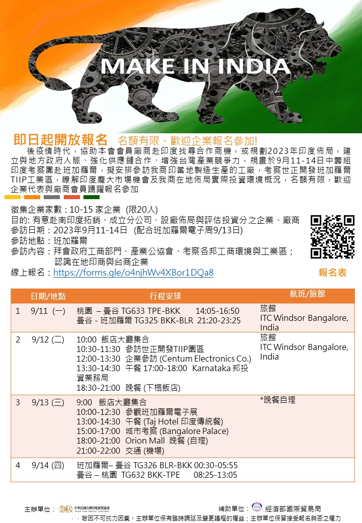 | 活動說明 | 後疫情時代,協助本會會員廠商赴印度找尋合作商機,或規劃2023年印度佈局,建立與地方政府人脈、強化供應鏈合作、增強台灣產業競爭力,規畫於9月11-14日中籌組印度考察團赴班加羅爾,擬安排參訪我商印當地製造生產的工廠,考察世正開發班加羅爾TIIP工業區,瞭解印度龐大市場機會及我商在地佈局實際投資環境概況,名額有限,歡迎企業代表與廠商會員踴躍報名參加 徵集企業家數 : 10-15 家企業 (限20人) 目的: 有意赴南印度拓銷、成立分公司、設廠佈局與評估投資分之企業、廠商 參訪日期:2023年9月11-14日 (配合班加羅爾電子周9/13日) 參訪地點:班加羅爾 參訪內容:拜會政府工商部門、產業公協會、考察各邦工商環境與工業區; 認識在地印商與台商企業 補助單位: 經濟部國際貿易局 主辦單位: 中華民國台灣印度經貿協會 協辦單位: 台灣區電機電子工業同業公會 線上報名:https://forms.gle/o4njhWv4XBor1DQa8