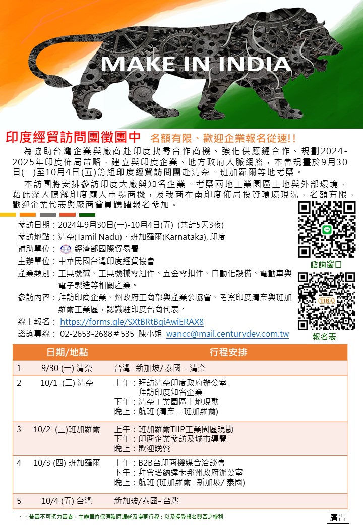 | 活動說明 | 台印經貿協會為協助台灣企業與廠商赴印度開發市場商機,規劃2024-2025年印度佈局,建立與地方政府人脈、強化供應鏈合作、增強台灣產業競爭力, 規畫於9月30日到10月4日間籌組印度考察團赴清奈、班加羅爾等城市,擬安排參訪印度知名企業,考察班加羅爾、清奈等地產業工業園區,洽邀印度知名企業來與參訪團成員洽談,舉辦B2B商業媒合會,瞭解印度龐大市場機會,及我商在地佈局實際投資環境概況,名額有限,歡迎企業代表與廠商會員踴躍報名參加。