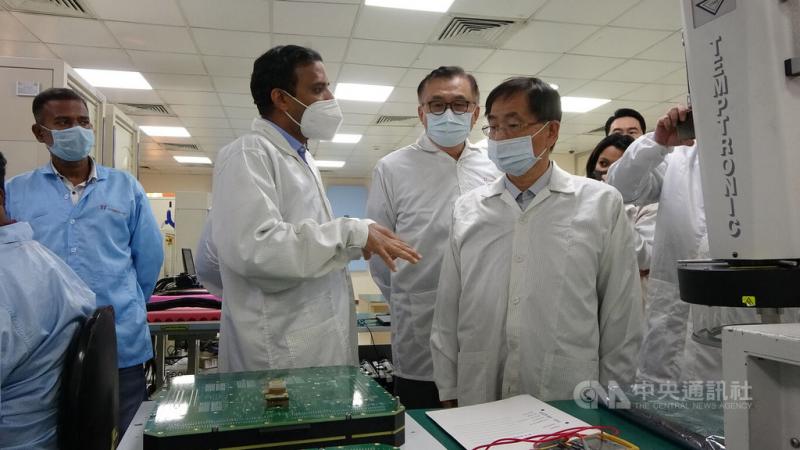 圖說: 駐印度代表葛葆萱(前右)17日至18日偕同駐清奈辦事處長王北平(後中)及近20名南印度台商,到卡納塔卡省首府班加羅爾市考察。圖為考察團17日參訪晶片測試所。中央社記者林行健班加羅爾攝 111年2月19日