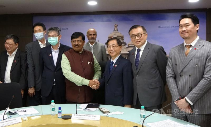 圖說: 駐印度代表葛葆萱(右3)17日至18日偕同駐清奈辦事處長王北平(右2)及近20名南印度台商,到卡納塔卡省首府班加羅爾市考察。圖為考察團17日與卡納塔卡省中大型工業廳長倪拉尼(Murugesh Nirani,左4)合影。中央社記者林行健班加羅爾攝 111年2月19日
